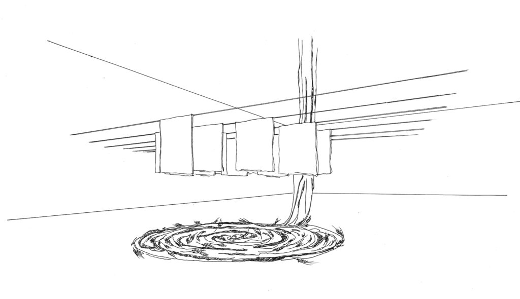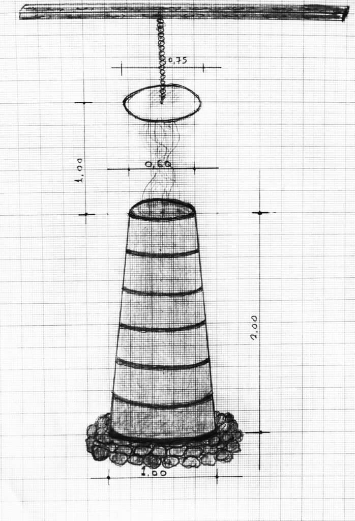 Από την κορυφή της καμινάδας βγαίνει δέσμη φωτός, η οποία αντανακλάται μέσα από νερό και στην ανοδική της πορεία ταυτίζεται με εγκατάσταση σχήματος οβάλ που κρέμεται κάθετα από το ταβάνι, σε απόσταση 1 μέτρου πάνω από τη σκουριασμένη καμινάδα. Το οβάλ έργο κρέμεται σε απόσταση τουλάχιστον 50 εκ. από το ταβάνι. Η συνολική εγκατάσταση τοποθετείται σε συνθήκες χαμηλού περιβάλλοντα φωτισμού. (βλ. Σχέδιο 1)