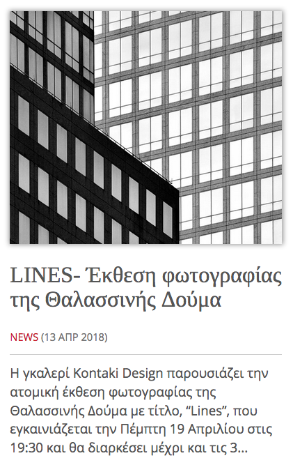 The Kontaki Design Gallery presents Thalassini Douma’s photographic exhibition entitled, “Lines, which will be inaugurated on Thursday, April 19th at 19:30 and will last until Thursday, May 3rd.