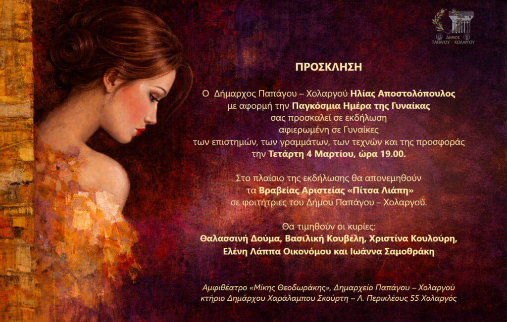 The Municipality of Papagos–Cholargos, on the occasion of International Women’s Day, is organizing an event dedicated to Women. 4.3. 2026. Amphitheatre, Papagos–Cholargos City Hall.